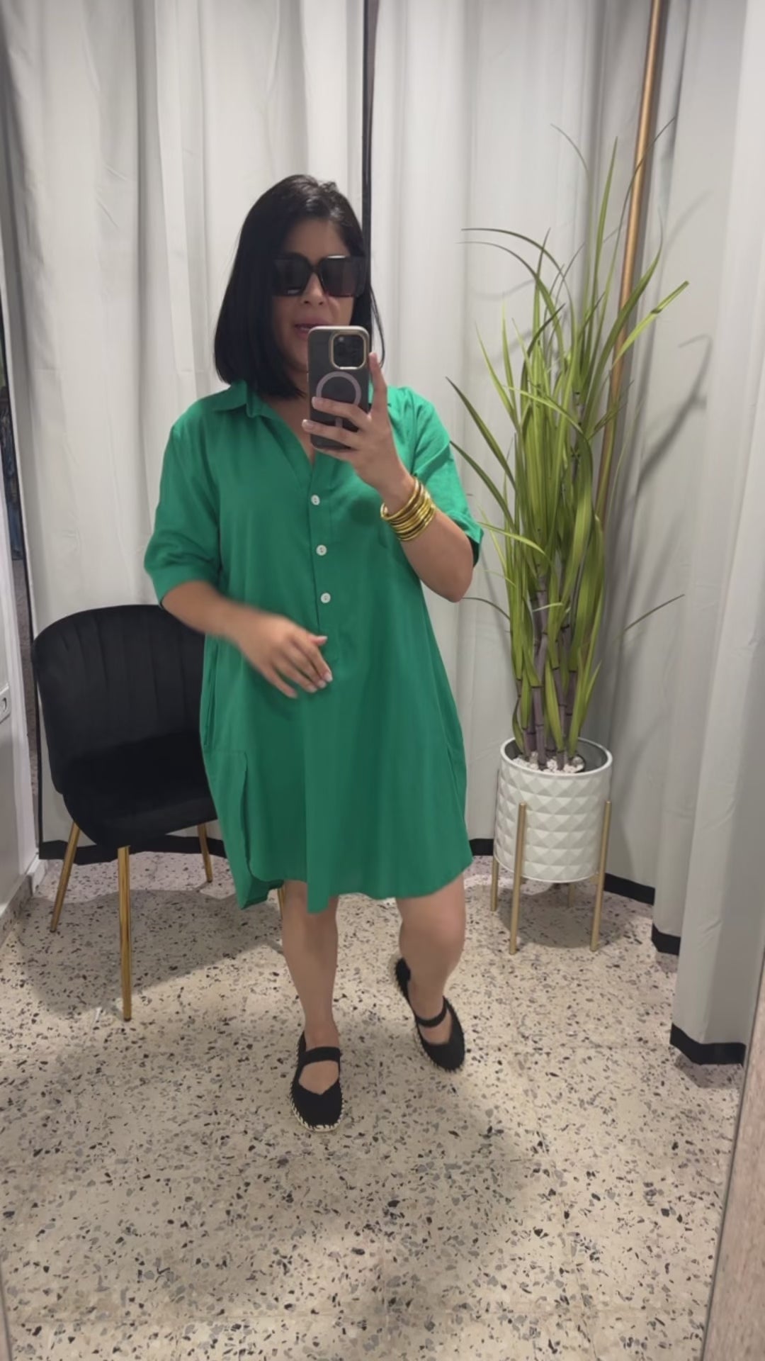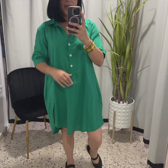 This beautiful shirt dress has a collar and nacre buttons, with short sleeve. The dress is cotton and linen fabric it also includes invisible pockets. This is available in SM and LXL. The model is wearing SM.