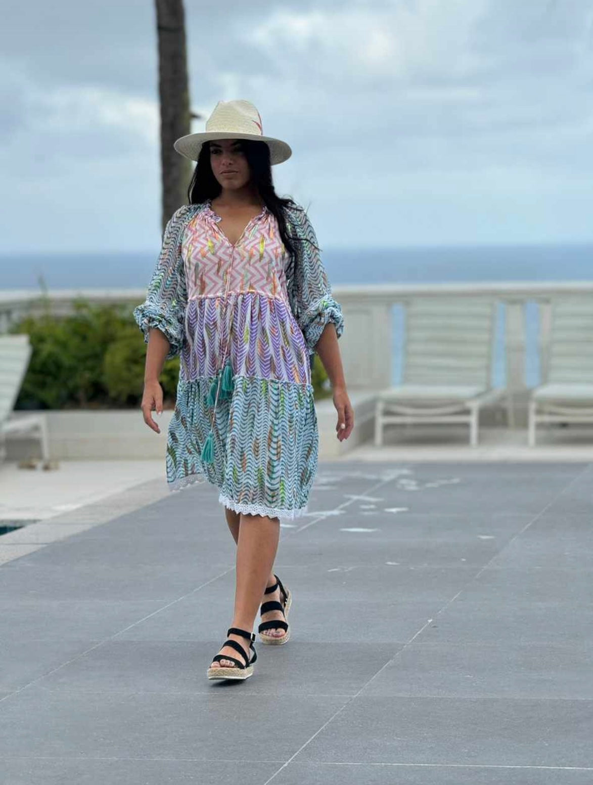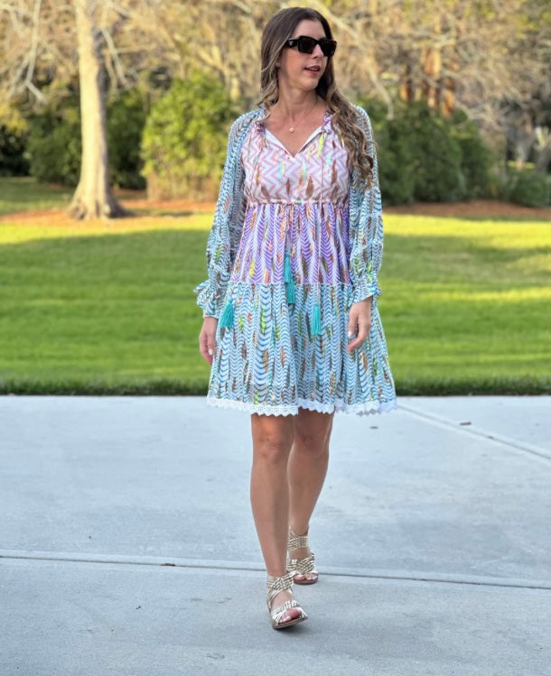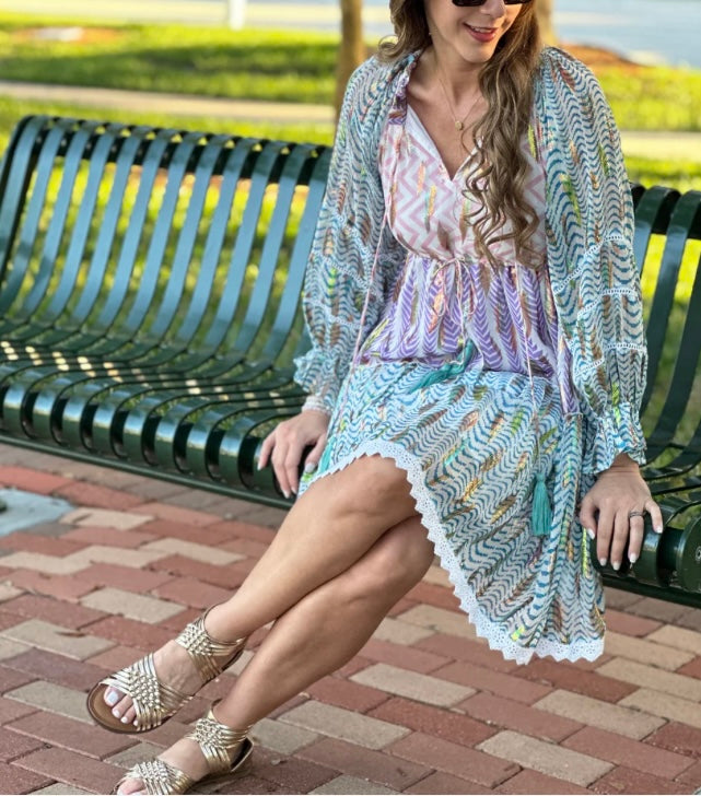 Mily Dress, a stunning embodiment of sophistication, featuring a rose gold print adorned with delicate tones of rose, soft hues of light purple and blue, and shimmering rose gold lurex accents. Meticulously crafted from the finest cotton, this dress showcases intricate cotton tassels, adding an extra touch of elegance to its charm. Ideal for both formal and semi-formal occasions. A beautiful ruffled neck with an adjustable necktie adorned with chic tassels at the front.