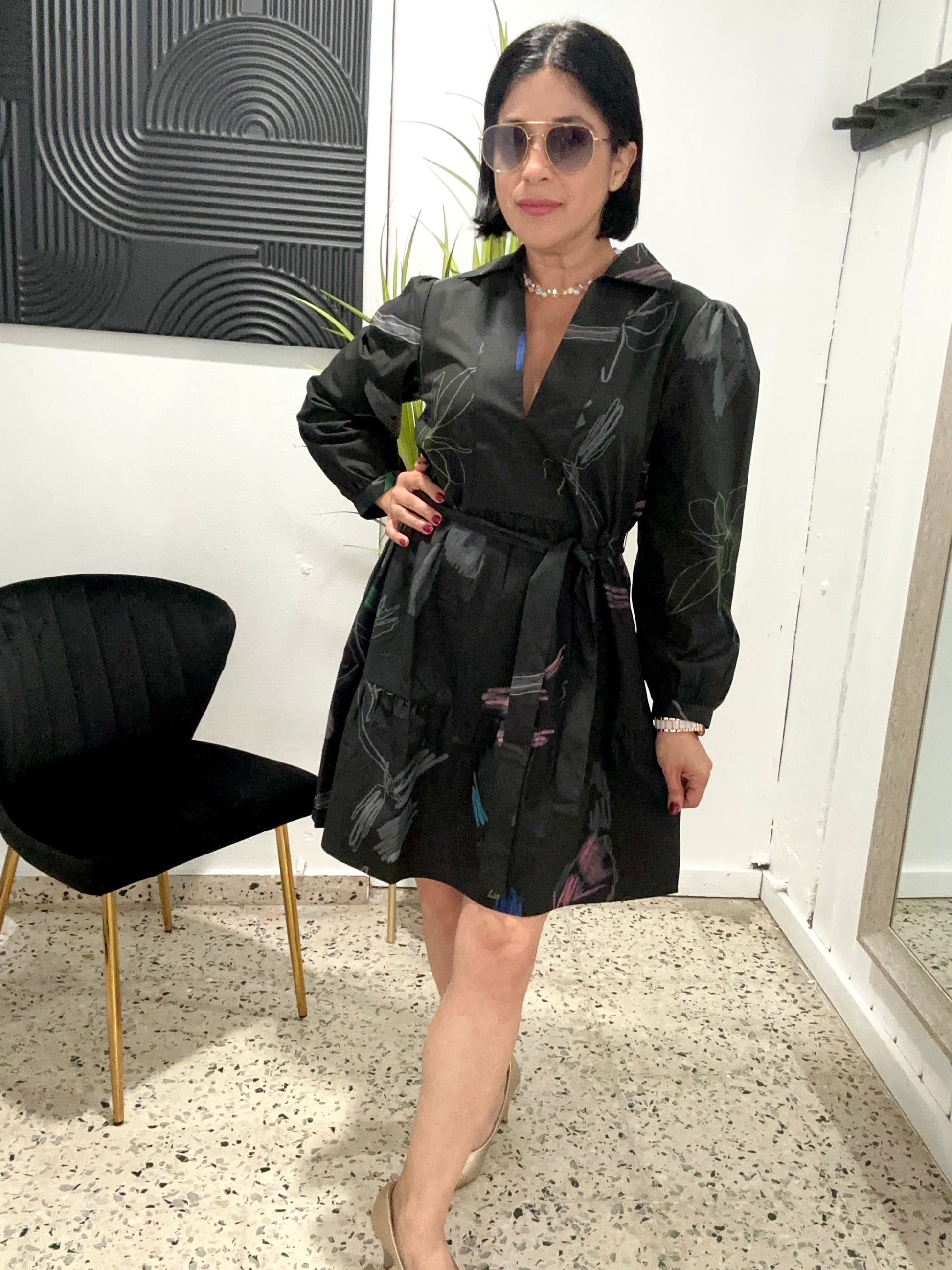 Vestido corto panelado de estilo camisero, manga larga tipo globo, y estampado de trazos sobre fondo negro.
