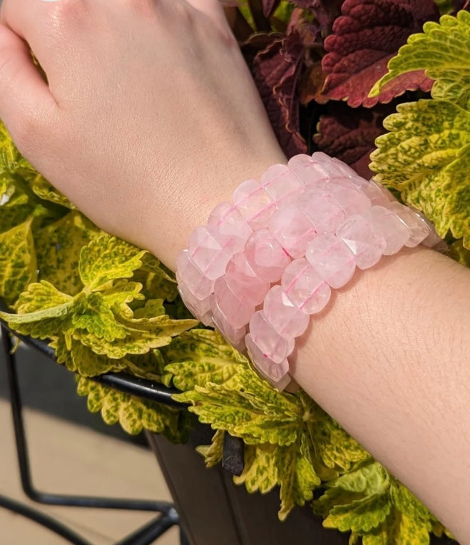 Our Rose Quartz healing bracelet will purify and open your heart at all levels, promoting love, self-love, friendship, deep inner healing, and a profound sense of peace. Its powerful energy nurtures your emotional well-being and restores confidence in relationships, while helping you release fears and resentments. This beautiful gift to yourself or others will nurture your connections and foster self-love. Its measurements are 15X8X5 mm, and it features a "rose cut" design, enhancing both style and the infusion of hope.
