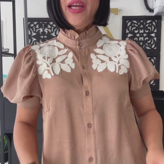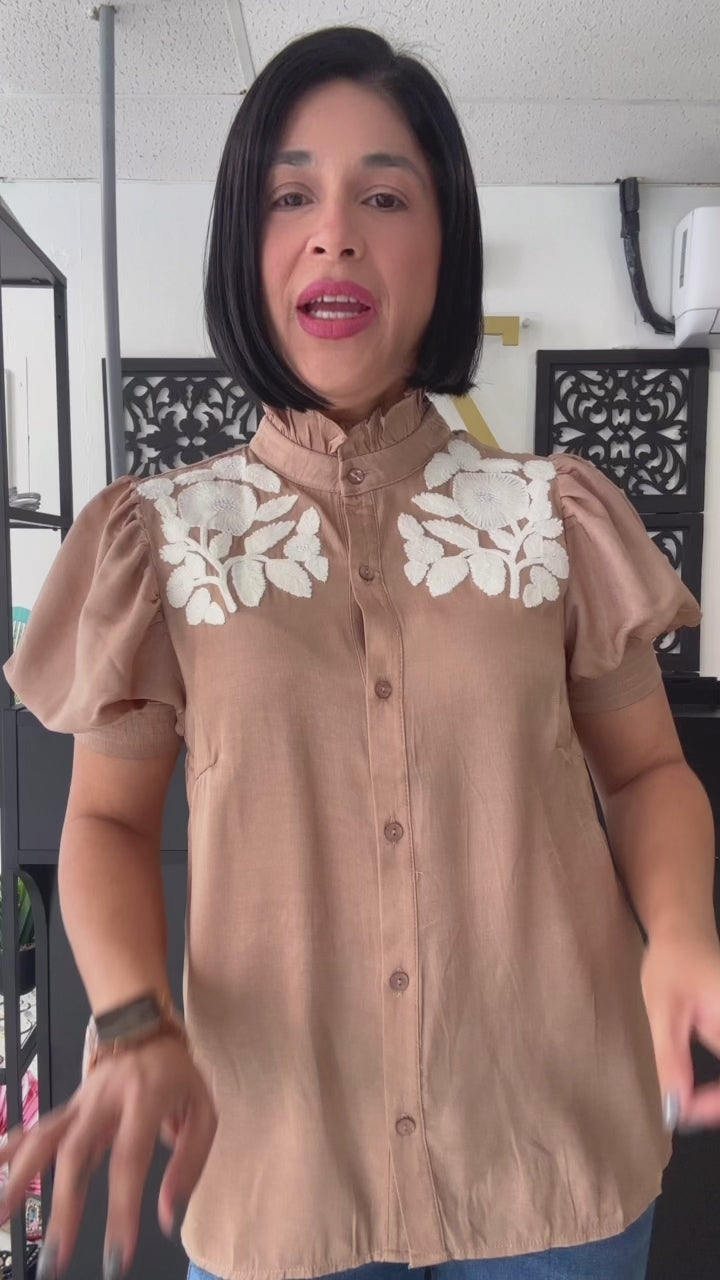 Ruffled neck puff sleeve top