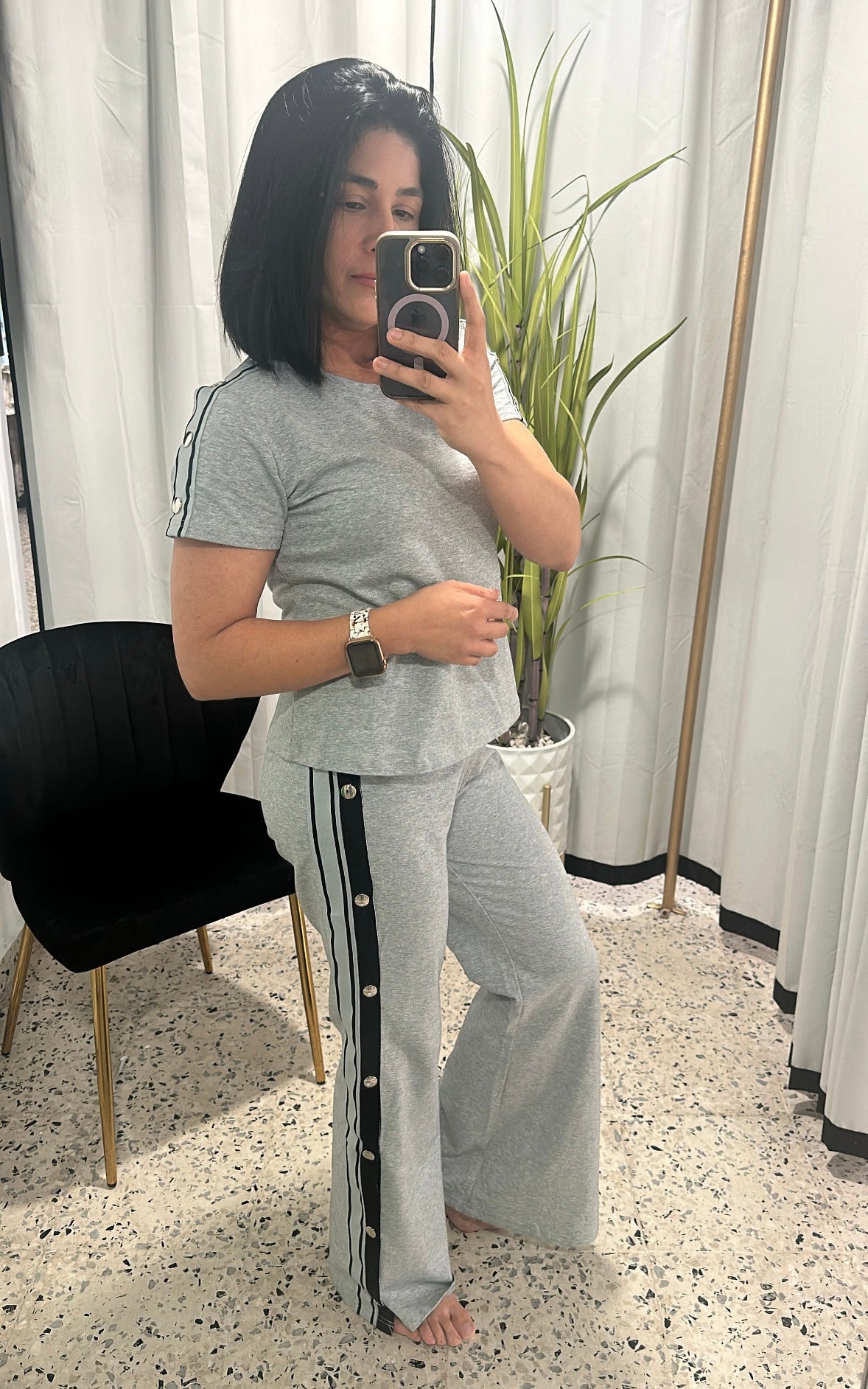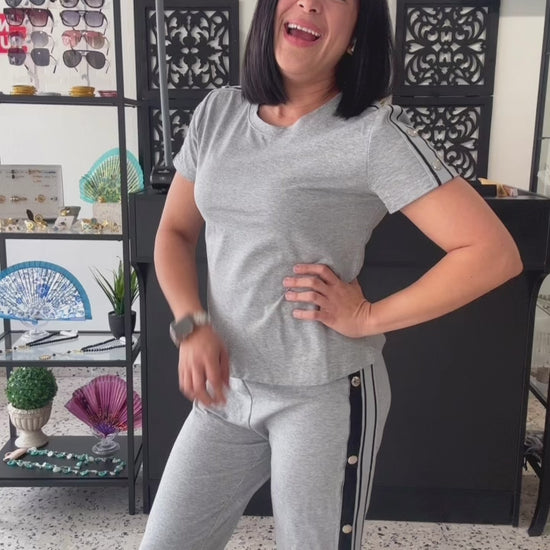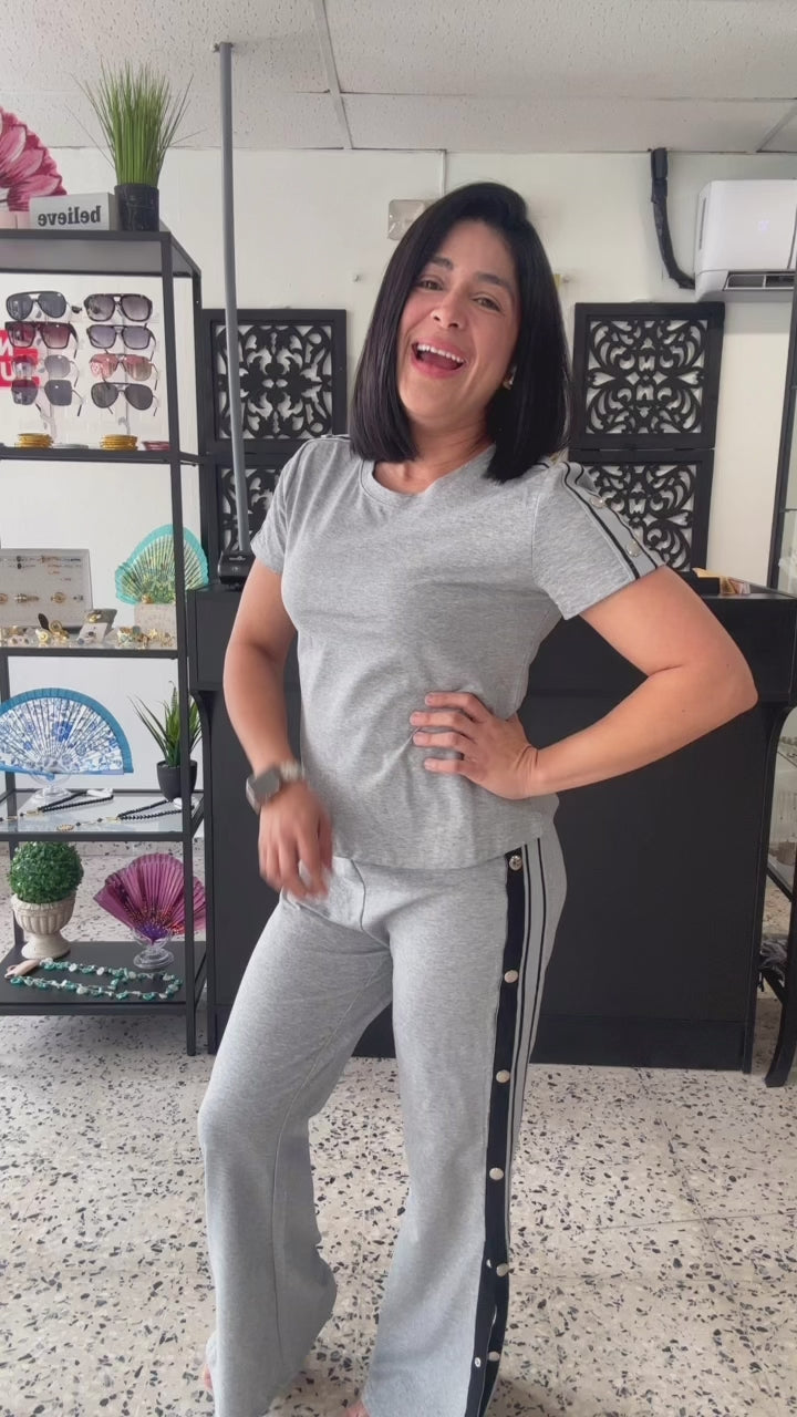 70% cotton 23% polyester 7% spandex. I’m wearing a size small.